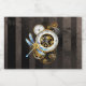 Antikaldagaler med guld och släpredskap, dekorerade med mekanisk dragonfly på brun, strimlad bakgrund. Steampunk.