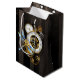 Antikaldagaler med guld och släpredskap, dekorerade med mekanisk dragonfly på brun, strimlad bakgrund. Steampunk.