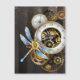 Antikaldagaler med guld och släpredskap, dekorerade med mekanisk dragonfly på brun, strimlad bakgrund. Steampunk.