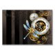 Antikaldagaler med guld och släpredskap, dekorerade med mekanisk dragonfly på brun, strimlad bakgrund. Steampunk.