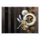 Antikaldagaler med guld och släpredskap, dekorerade med mekanisk dragonfly på brun, strimlad bakgrund. Steampunk.