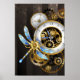 Antikaldagaler med guld och släpredskap, dekorerade med mekanisk dragonfly på brun, strimlad bakgrund. Steampunk.
