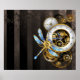 Antikaldagaler med guld och släpredskap, dekorerade med mekanisk dragonfly på brun, strimlad bakgrund. Steampunk.