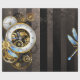 Antikaldagaler med guld och släpredskap, dekorerade med mekanisk dragonfly på brun, strimlad bakgrund. Steampunk.