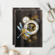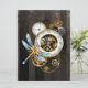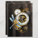 Antikaldagaler med guld och släpredskap, dekorerade med mekanisk dragonfly på brun, strimlad bakgrund. Steampunk.