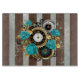 Mönsterad, antika klocka, försedd med smycken, händer och latinska siffror i guld och med turkos ro på brun, strimmig bakgrund. Steampunk stil.