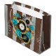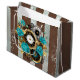 Mönsterad, antika klocka, försedd med smycken, händer och latinska siffror i guld och med turkos ro på brun, strimmig bakgrund. Steampunk stil.