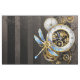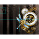 Antikaldagaler med guld och släpredskap, dekorerade med mekanisk dragonfly på brun, strimlad bakgrund. Steampunk.
