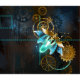 Steampunk är fullt med blå, genomskinlig lampa av vingar och grönt på bärn, brun, texturerad bakgrund. Steampunk stil.