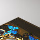 Sammansättning av rund steampunk-klocka med svart romerskt numeriskt uppslag, dekorerat med guld och släpredskap, blå morfobutterflugor och skadade linser på brun stripe-bakgrund. Steampunk stil.