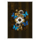 Sammansättning av rund steampunk-klocka med svart romerskt numeriskt uppslag, dekorerat med guld och släpredskap, blå morfobutterflugor och skadade linser på brun stripe-bakgrund. Steampunk stil.