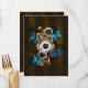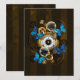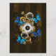 Sammansättning av rund steampunk-klocka med svart romerskt numeriskt uppslag, dekorerat med guld och släpredskap, blå morfobutterflugor och skadade linser på brun stripe-bakgrund. Steampunk stil.