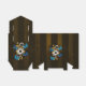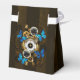 Sammansättning av rund steampunk-klocka med svart romerskt numeriskt uppslag, dekorerat med guld och släpredskap, blå morfobutterflugor och skadade linser på brun stripe-bakgrund. Steampunk stil.