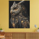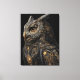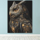 An exquisitely detailed mechanical owl blends realistic feathers with intricate brass gears, cogs, and clockwork mechanisms against a dramatic black background. Golden highlights accent every feather and metallic plate while its intense, lifelike eye draws the viewer in. This striking fusion of nature and Victorian engineering radiates mystery, precision, and steampunk elegance, making it perfect for canvas prints, posters, phone cases, mousepads, throw pillows, wall art, and décor that adds bold industrial fantasy to any space.