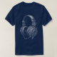 Retro industrial headset illustration with gears and mesh panels in monochrome line art, appealing to tech enthusiasts, musicians and vintage-inspired apparel fans.