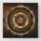 Olika, fantastiska klockor med guld och brasväxlar på brunt, rostfritt underlag. Steampunk stil.