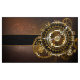 Olika, fantastiska klockor med guld och brasväxlar på brunt, rostfritt underlag. Steampunk stil.