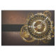 Olika, fantastiska klockor med guld och brasväxlar på brunt, rostfritt underlag. Steampunk stil.