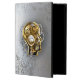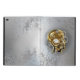 Conceptuellt, mekaniskt, mänskligt huvud med antikemalmanometer och metall-växlar mot gråttets industriella bakgrund. Steampunk stil.