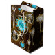 Turcitylinser med en antik klocka med släpredskap och gyllene nycklar på rostfri, brun bakgrund. Steampunk stil.