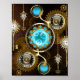 Turcitylinser med en antik klocka med släpredskap och gyllene nycklar på rostfri, brun bakgrund. Steampunk stil.