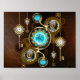 Turcitylinser med en antik klocka med släpredskap och gyllene nycklar på rostfri, brun bakgrund. Steampunk stil.