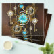 Turcitylinser med en antik klocka med släpredskap och gyllene nycklar på rostfri, brun bakgrund. Steampunk stil.