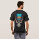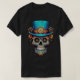 He's a cool cat, in his blue top-hat and shining, white teeth. Steampunk skull design images on a black, short sleeve t-shirt for men and women.