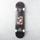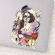 Steampunk-kvinnan day of the dead som bär på sockerskalle. Tryckt mest i lila. Runt henne är geas, skalle, ro och nycklar.