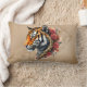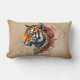 Steampunk Tiger med Ro. Bilden har en närbild av en tigers huvud i profil, som återges i en digital konst stil. Tigern har orange och svart rand, med vit päls kring ansikte. En metallisk ryggrad av stil, steampunk, försedd med växlar och ro kurvor runt tigerns nacke. Bakgrunden är ett mjukt, beige färg med blommönster. Den allmänna stämningen är en blandning av vildhet och mekanisk elegans.