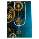Turkos, texturerad, steampunk bakgrund med släp och guld, silver nyckel och klocka. Steampunk stil.