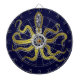 Detta tentacled steampunkhavsmonster har åtta binda-något liknande guld- bihang, ett centralsilver utrustar, och överflöd av utrustar och kasta i sig danande upp dess huvud, ögon och sugkoppar. Det är en robotbläckfisk/kraken, ett metallmaskinmonster för någon som gillar geeky science fiction-/fantasivarelser. Mörk blått bakgrundsfärg är anpassadet.