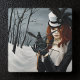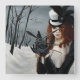 Steampunk-kvinna med rött hår på en vintern promenad som släpper ut hennes dragonfly-budbärare med nyckel