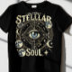 Här är en känslosam och rymdinspirerad t-shirt-design med ett mystiskt, allseende öga omgivet av måne faser, stjärnor och kosmisk mönster, med frasen "Stellar Soul." 🌙 ✨ 🔮