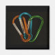 Fotografi av färgfulla klätterkarabiners i sten på svart bakgrund.