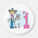 Första födelsedag söt land western/cowboyen/rodeokettejpstuva i jeans och rosa bandana med häst och katt, stor rosa nummer 1.