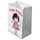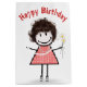 Cute stick-flicka med hår, smygare, ginghamklänning, pärlhalsband på vit bakgrund. Grattis på födelsedagen kan redigeras. Bakgrunden till färg kan ändras.
