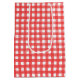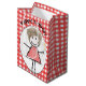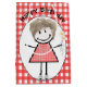 Cute stick-flicka med hår, smygare, ginghamklänning, pärlhalsband på ett rött och vitt gingham mönster. Grattis på födelsedagen kan redigeras.