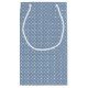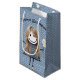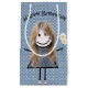 Cute stick figur-flicka med blond hår, senor, pärlhalsband och denim blå klänning på en polkprickbakgrund för födelsedag. Text kan ändras.