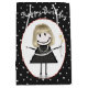Cute stick figur-flicka med blond hår, senor, polka-punktklänning och daisy bouquet på svart och vit polka-punkt mönster. Text kan redigeras.