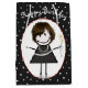 Cute stick figur tjej med hår, senor, polkattklänning och daisy bouquet på svart och vit polka punkt mönster. Text kan redigeras.