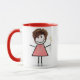 Cute stick figur-flicka med daisy bouquet, senor, hår, pärlhalsband och gingham-klänning med ett inspirationstecken.