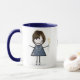 Cute stick figur flicka med daisy bouquet, senor, hår, pärlhalsband och blå jean-klänning med inspirationstecken.