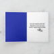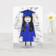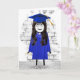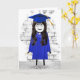 Cute stick-flicka med långt mörk hår, studenten-diploma, blå gåva, hylsor och hylsa för student grattisar.