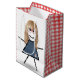 Cute stick-flicka med blond hår och röda glasögon på vitt och gingham mönster.