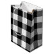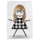 Cute stick-flicka med hår, klädklänning och glasögon på vitt med svart och vit buffel plaid mönster.
