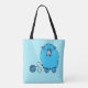 Det här är en ovanpå axeln och mycket användbar väska för stickningen som kan vara personlig med ditt namn. Det är blek blått, dekorerat med två lustigt, fluffy får, vardera med en boll av garn, i rosa och blått, med ord, "Sticka ett. Enkelt." Den andra sidan har ett matchande blått får.