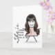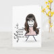Söt stickflicka med långt hår, glasögon och blomklänning på vit bakgrund för systerns födelsedag.