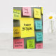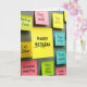 A collection of colorful sticky notes with various reminders is attached to an office cubicle wall