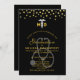 En inbjudan till en medicine doktors examensfirande. Designad med falska guldconfettiprickar längs överkanten. En vit caduceussymbol med bokstäverna M D på vardera sidan. Ett grått stetoskop bakom festtexten.